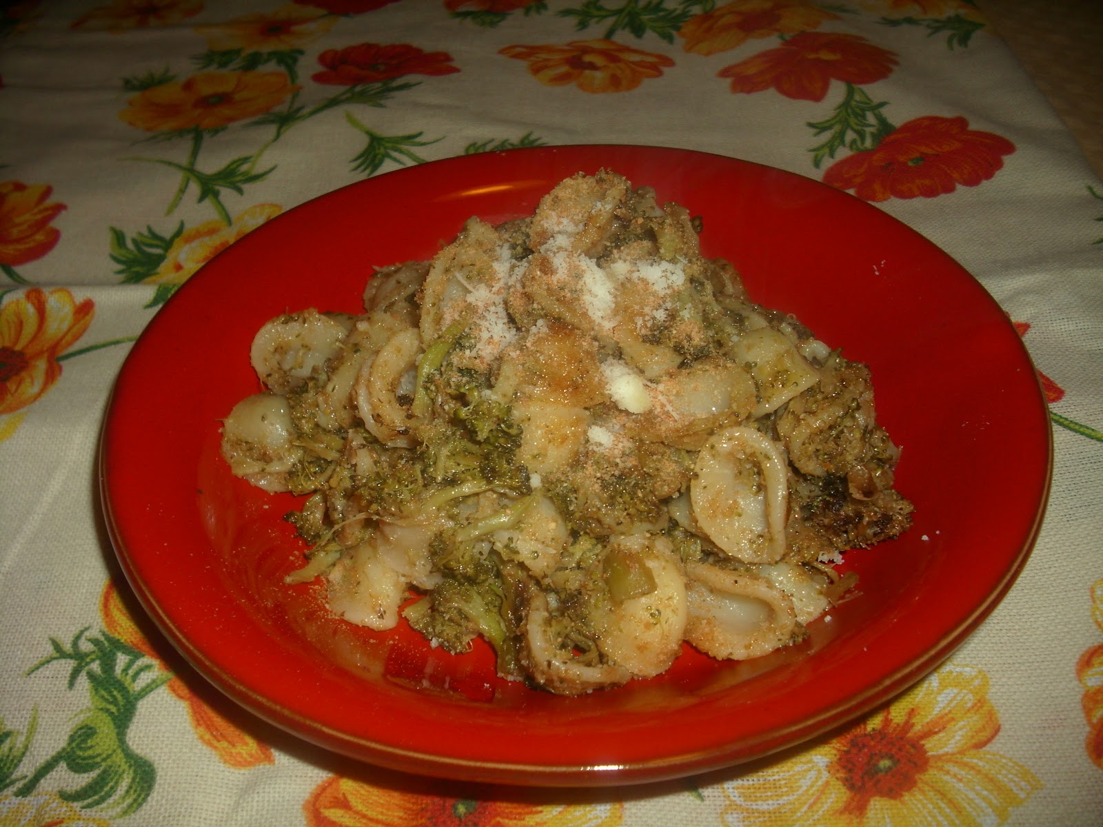 buttate sui broccoli le orecchiette cotte al dente,il pangrattato e un filo d'olio