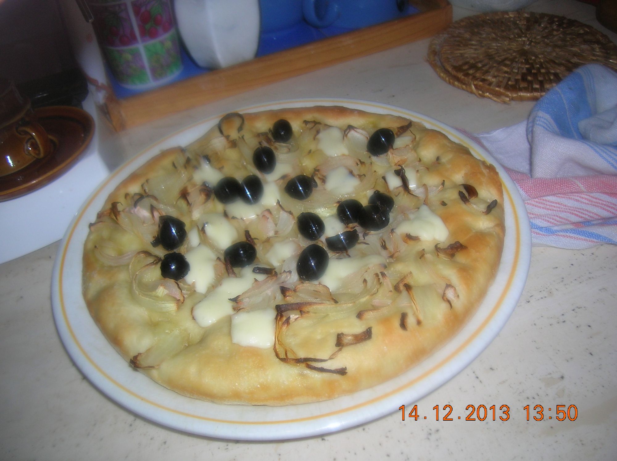 - 100gr. di lievito madre in 60ml di acqua tiepida.. 500gr. di farina ...2gr. di lievito di birra fresco ....2cucchiai di olio..pizzico di sale ..1cucchiaino di zucchero ..350gr. di cipolla...prosciutto cotto e formaggio e olive nere...