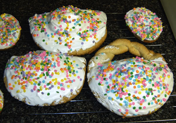 Ora metto la glassa sopra i biscotti ancora tiepidi e prima che la glassa si raffreddi, metto gli zuccherini colorati sopra.