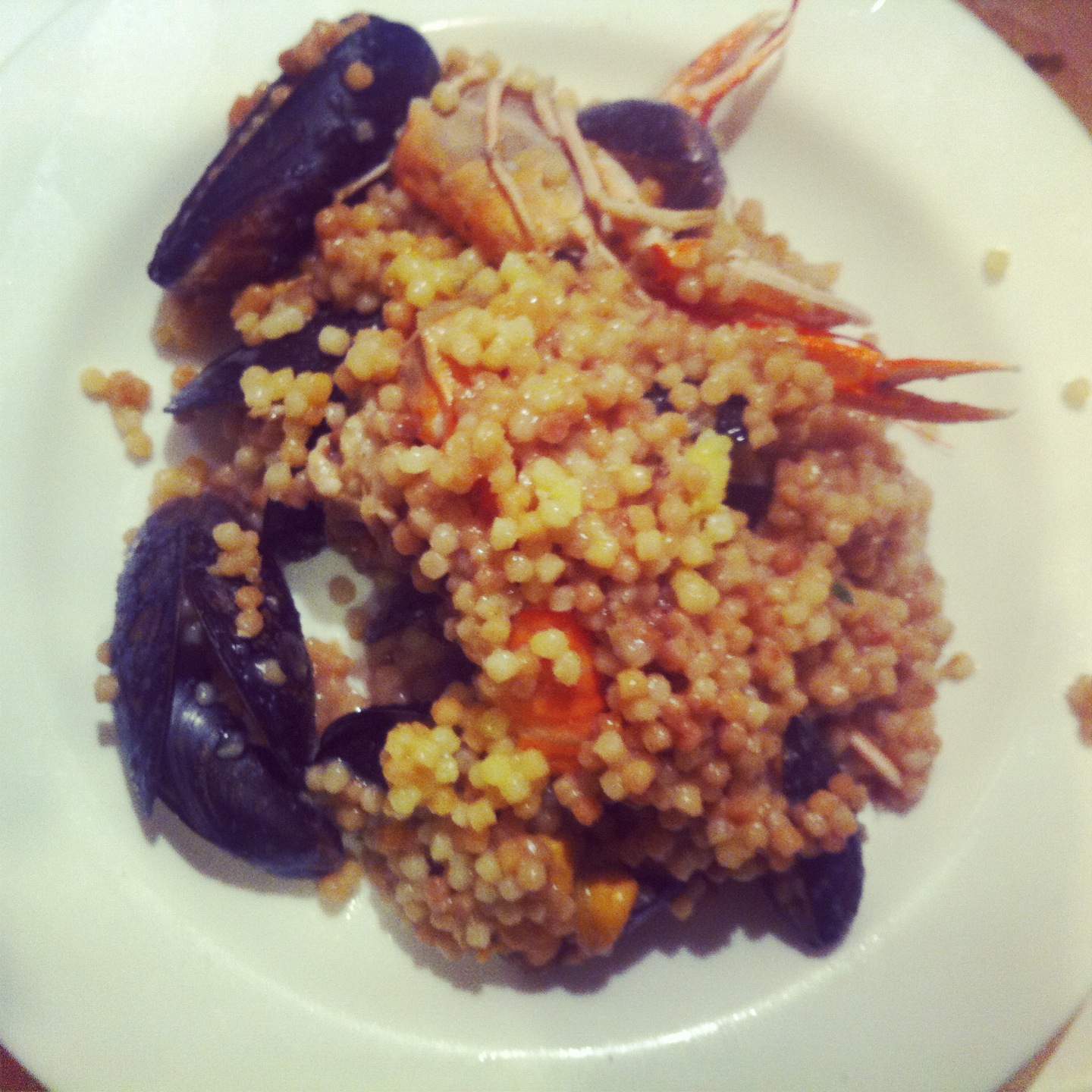 Ora aggiungiamo la fregola al nostro trito e facciamola tostare per qualche minuto, aggiungiamo il brodo delle cozze e del vino bianco, saltiamo e aggiungiamo il brodo man mano che la fregola si asciuga. Cuociamo per circa 20 min (assaggiate di tanto in tanto per testare il grado di cottura) e aggiungete del sale se lo ritenete necessario. Quando mancano circa 5 minuti alla fine della cottura, aggiungiamo cozze e scampi (comprese le teste usate per il brodo) e facciamo saltare il tutto. Et voilà: la nostra fregola è pronta per essere servita ai nostri ospiti. Buon appetito!!!