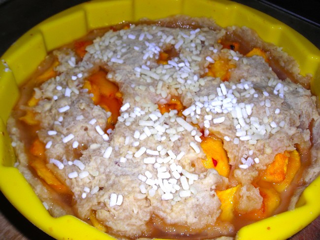 Versate il composto in stampo piccolo. tagliate a spicchi due o tre mezze pesche e sistemarle sulla torta. Cospargetela con dello zucchero in granella