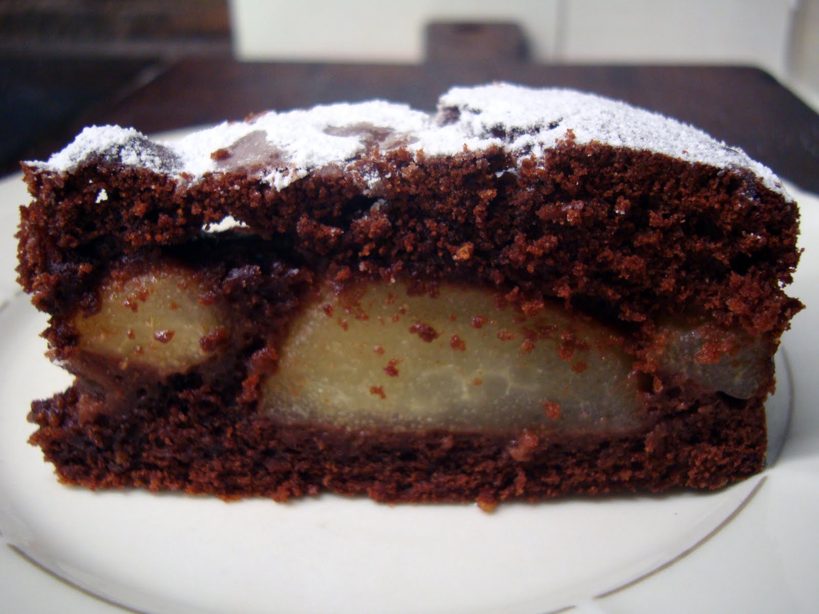 Versare lo zucchero in una ciotola, unire il burro morbido, le uova, il lievito, la farina ed il cioccolato fuso. Versare l'impasto in uno stampo da plumcake imburrato ed infarinato. Sbucciare le pere lasciandole intere, quindi appoggiarle lungo tutto lo stampo da plumcake. Far cuocere per circa 40 minuti a 180°.