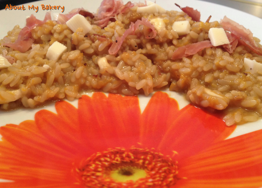 - 2 tazzine di riso a persona, zucca, speck, zafferano, cipolla, olio, peperoncino, provola affumicata, dado