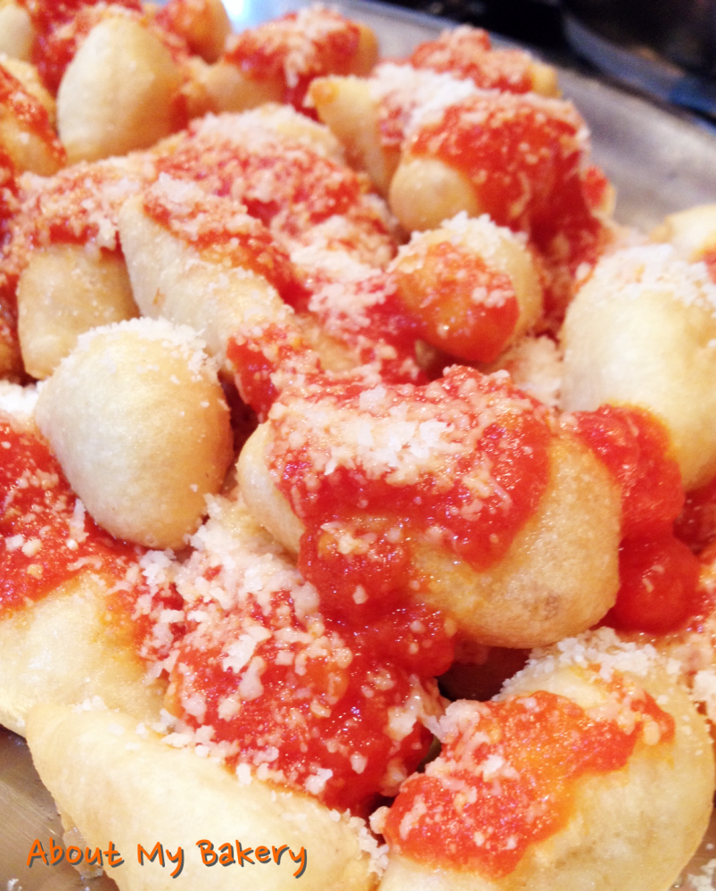 Friggere due pugni di scazzuoppoli per volta, o comunque regolatevi in base alla grandezza della vostra padella. Girateli solo una volta e vedrete come si gonfiano ancora in cottura. Una volta dorati, scolateli dall’olio in eccesso e sistemateli in una scolapasta rivestita di carta assorbente, asciugateli bene con dell’altra carta, e posizionateli in un vassoio da portata.