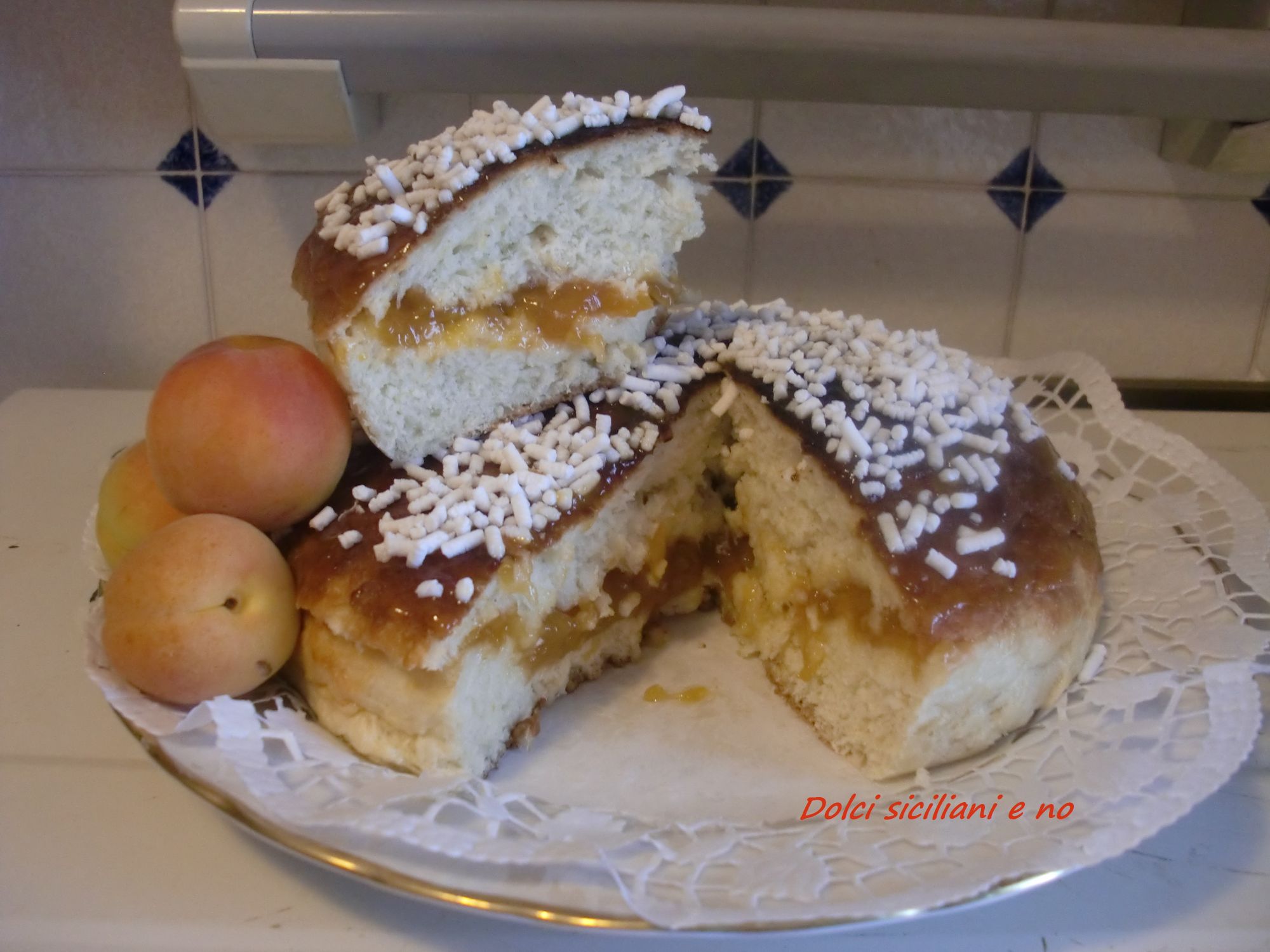 Quindi , dopo averla chiusa e richiusa diverse volte verso l’interno, l’ho adagiata nella Teglia foderata con carta da forno e l’ ho fatta riposare per un’ora e mezza in ambiente caldo, sempre coperta. L’ho spennellata delicatamente con l’albume rimescolato con lo zucchero e l’ ho infornata. In forno caldo statico a 180° per circa 10 minuti. Una volta fredda l’ho divisa a metà e riempita con confettura d’albicocche. L’ho richiusa e spennellata con un po’ di confettura d’albicocche per fare aderire la granella di zucchero.