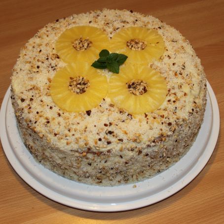 Mettere in una ciotola molto capiente la farina setacciata, lo zucchero, il lievito e il sale. Mescolare e fare un buco al centro dove mettere l'olio, l'acqua, i tuorli, l'aroma limone e la vanillina. Lasciare da parte e montare a neve fermissima gli albumi con il cremor tartaro. Riprendere il composto precedente e mescolare con le fruste elettriche fino ad ottenere un impasto liscio ed omogeneo. Incorporare ora delicatamente dal basso verso l'alto gli albumi a neve. NON imburrare la teglia (diametro 28 non antiaderente) e versatevi l'impasto. Infornare nel ripiano più basso del forno per 60 minuti a 160° e quindi per 15 minuti a 175°. Appena sfornata capovolgere e lasciar raffreddare a testa in giù (aiutarsi con tazzine da caffè). Togliere dalla tortiera aiutandosi con una spatola solo quando è totalmente fredda. Farcire con crema pasticciera e cubetti di ananas. Infine ricoprire con noccioline e cocco in polvere.