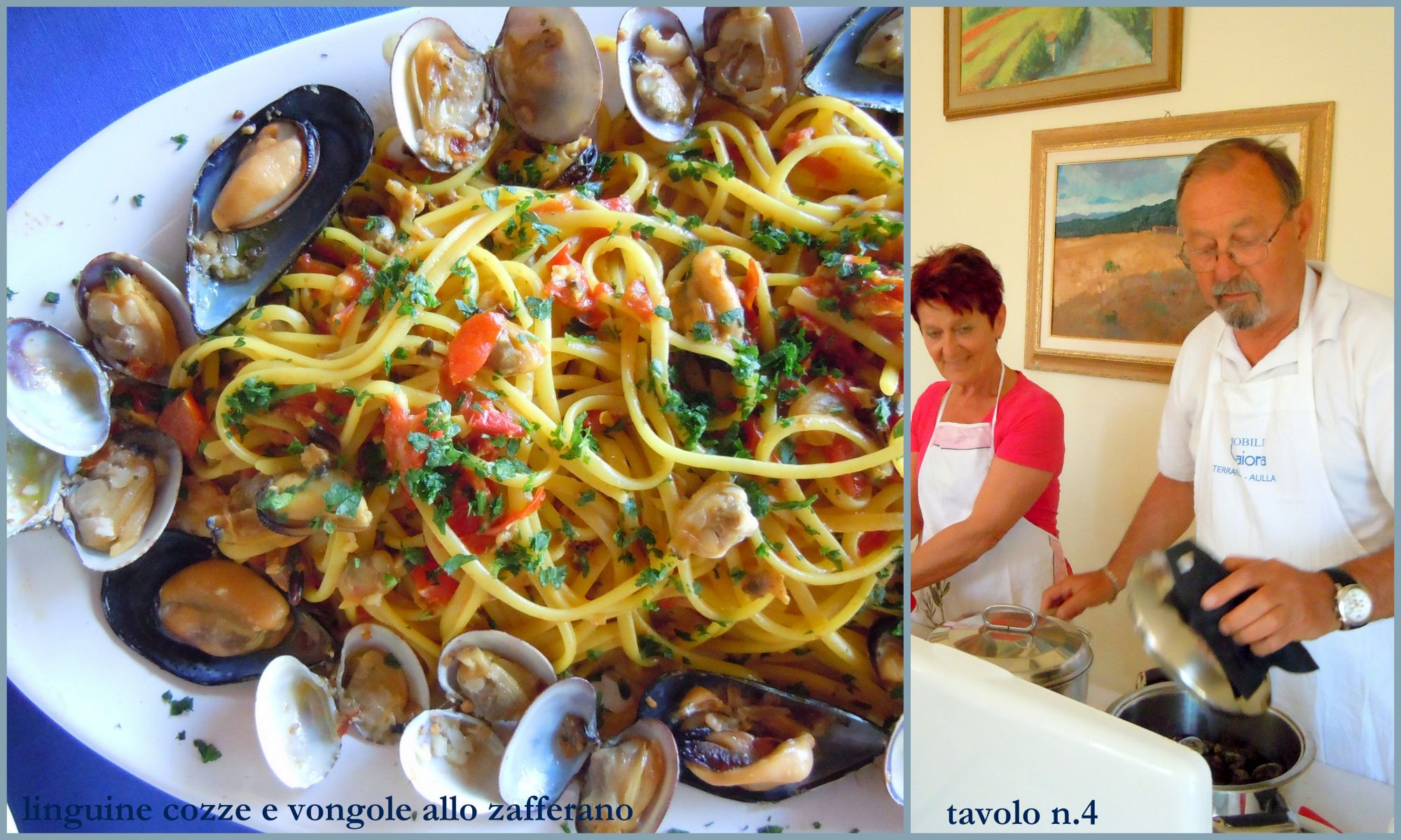 Per ultimo prepareremo le linguine, prenderemo una pentola alta con acqua e sale, aspetteremo che raggiunga il bollore e getteremo le linguine. Quando queste saranno al dente, le scoleremo e le aggiungeremo alla pentola con le vongole, alla quale poco prima avremmo anche aggiunto le cozze. Gireremo bene il tutto e aggiungeremo le bustine di zafferano, sempre mescolando per evitare che vi siano parti eccessivamente colorate dallo zafferano e parti bianche, per aiutarci con la cottura ed evitare che la pasta si asciughi useremo l'acqua di cottura delle cozze, che avremo precedentemente filtrato.