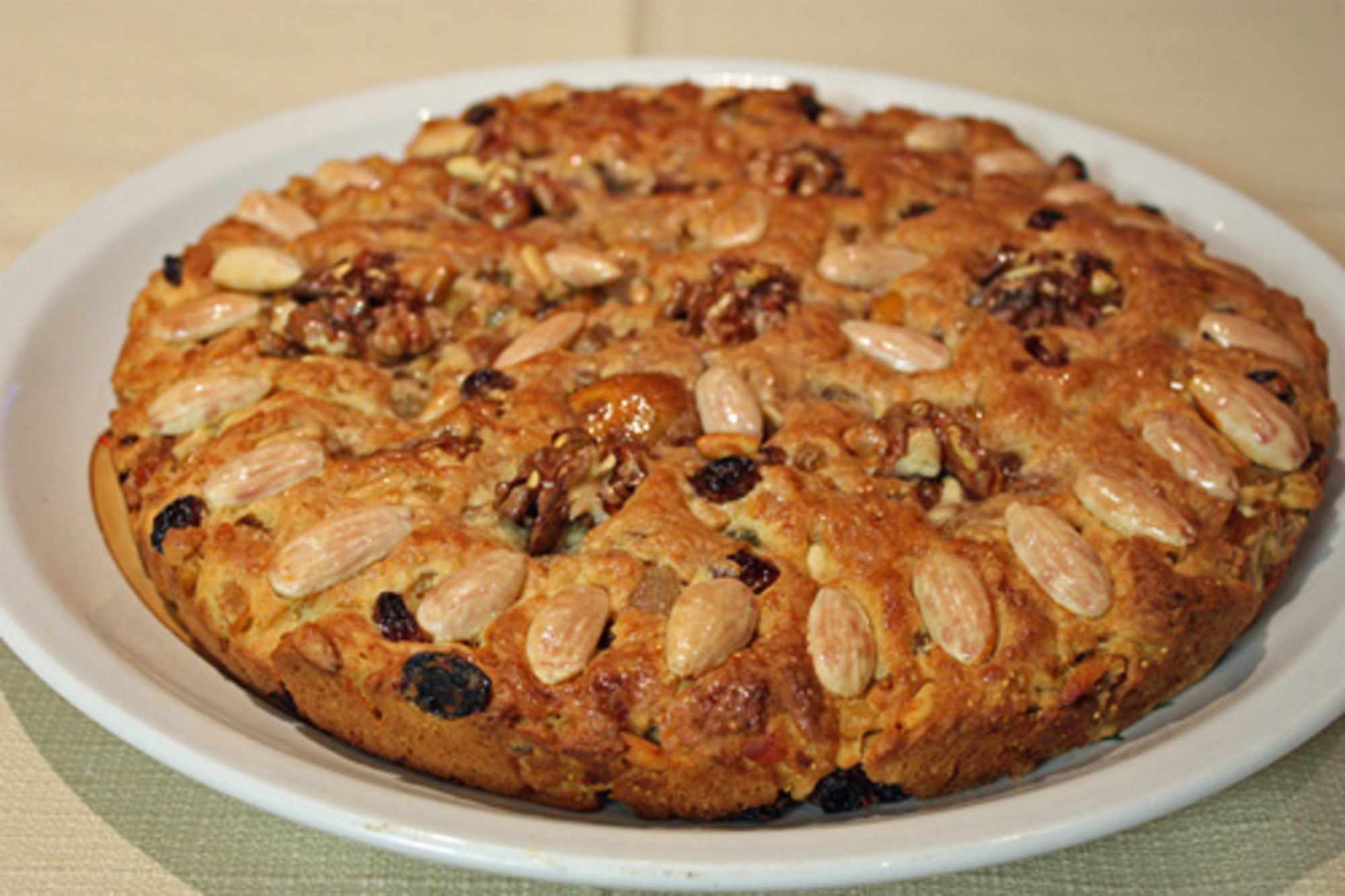 Sbattere le uova con lo zucchero; aggiungere la farina, il burro fuso, il lievito e il latte. Quando l'impasto è omogeneo aggiungere la frutta precedentemente tagliata fine. Mettere l'impasto in una tortiera e decorare con la frutta secca per la guarnizione. Cuocere a 180° per circa 50 minuti finchè risulta bello dorato.