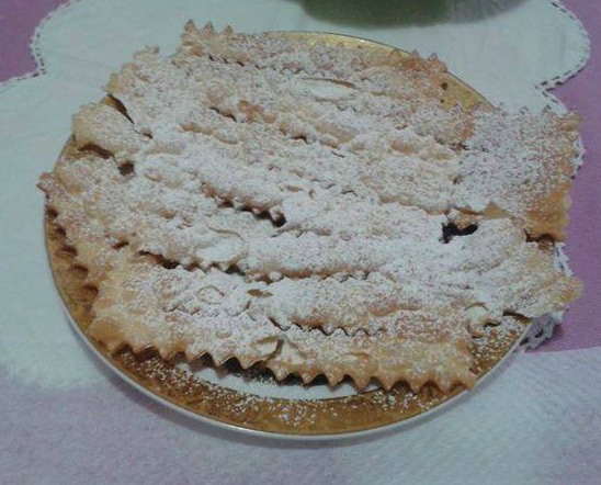 Stendete la pasta con il mattarello, infarinando bene il piano, ad uno spessore di circa 2 millimetri e con la rotella tagliapasta ritagliare le chiacchiere. Sistematele sulla placca ricoperta di cartaforno, spennellatele con il burro fuso e spolverizzatele con zucchero a velo. Cottura: 200° per 8-10 minuti, senza farle seccare troppo.