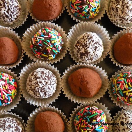Sbriciolate grossolanamente (no farina) i biscotti. Aggiungete gli altri ingredienti ed impastate bene. Lasciate riposare in frigorifero per una trentina di minuti e quindi ricavate dall'impasto delle palline della stessa dimensione e passatele nella guarnizione scelta.