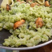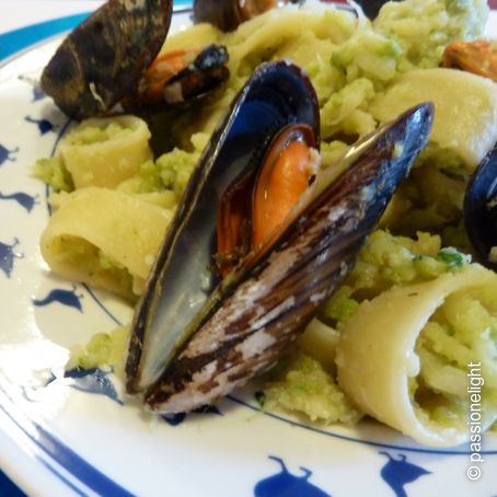 Nella stessa padella schiacciate con una forchetta il broccolo romanesco fino a formare una cremina con l'aiuto di qualche cucchiaio di acqua delle cozze e della pasta.