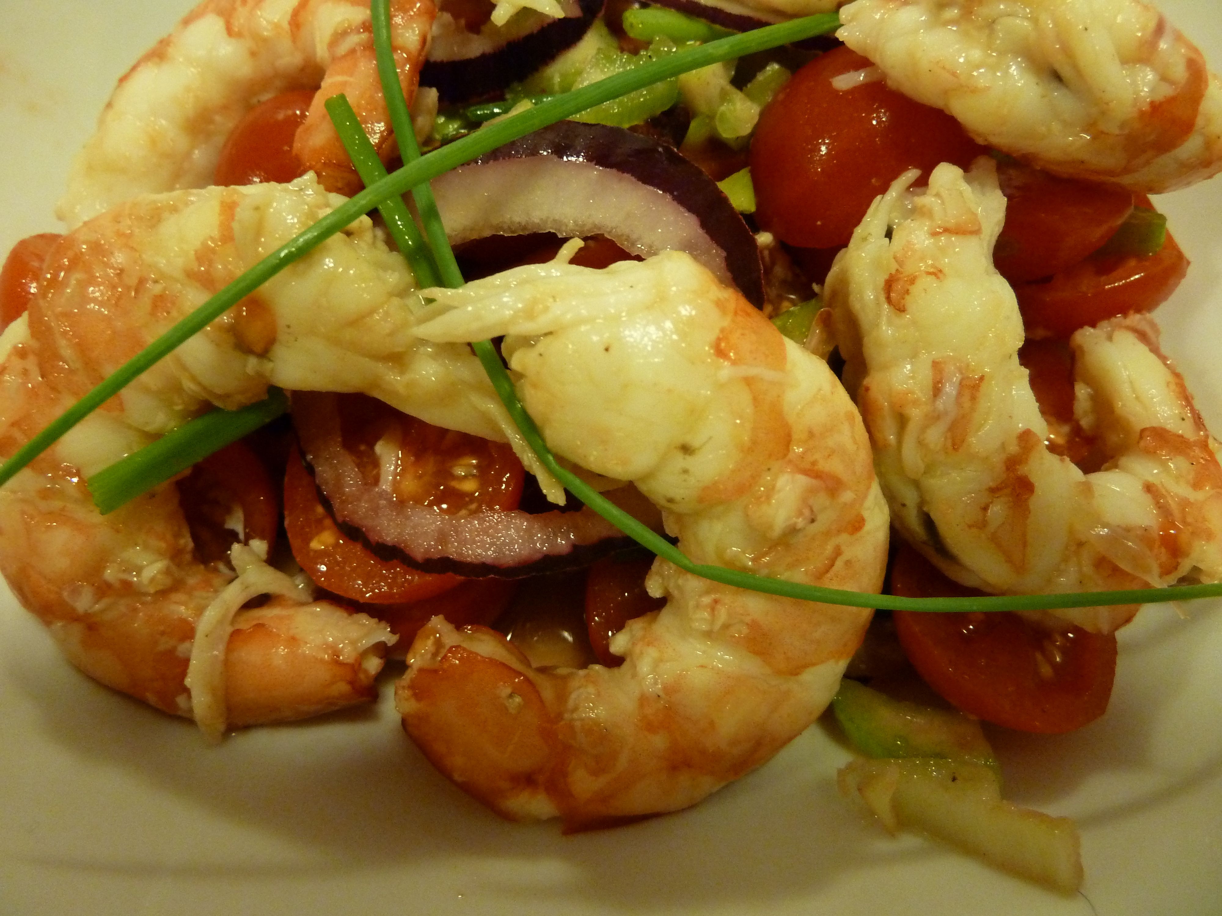 Lasciamo le verdure a macerare e bolliamo i gamberoni, pochissimo, 5 minuti.