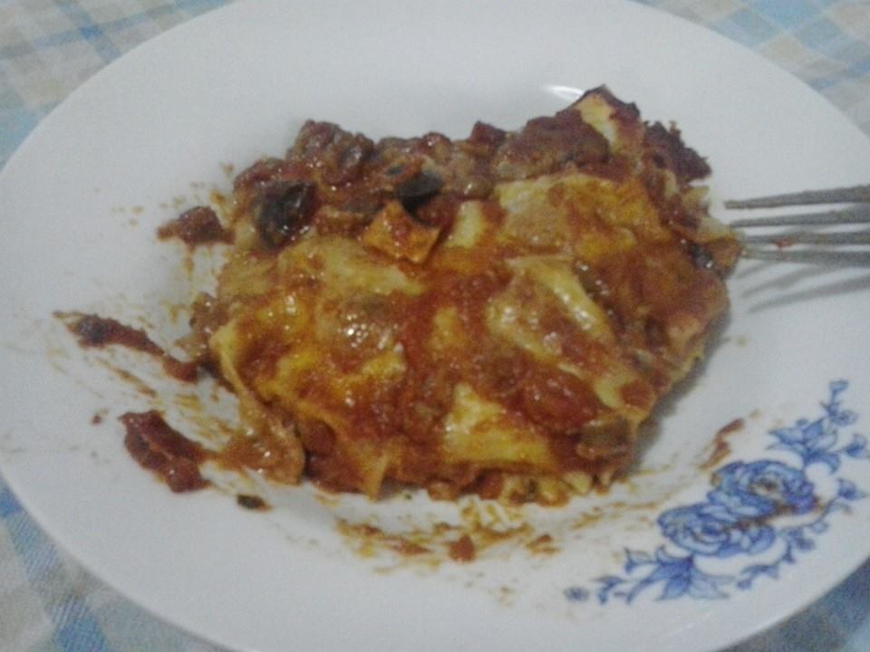 Fare un fondo di cipolla e aglio tritati finemente. Aggiungere l'olio e fare appassire la cipolla. Aggiungere i funghi e la carne macinata. Fare rosolare in padella per qualche minuto. Unire la passata di pomodoro e salare. Farlo cuocere.