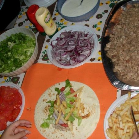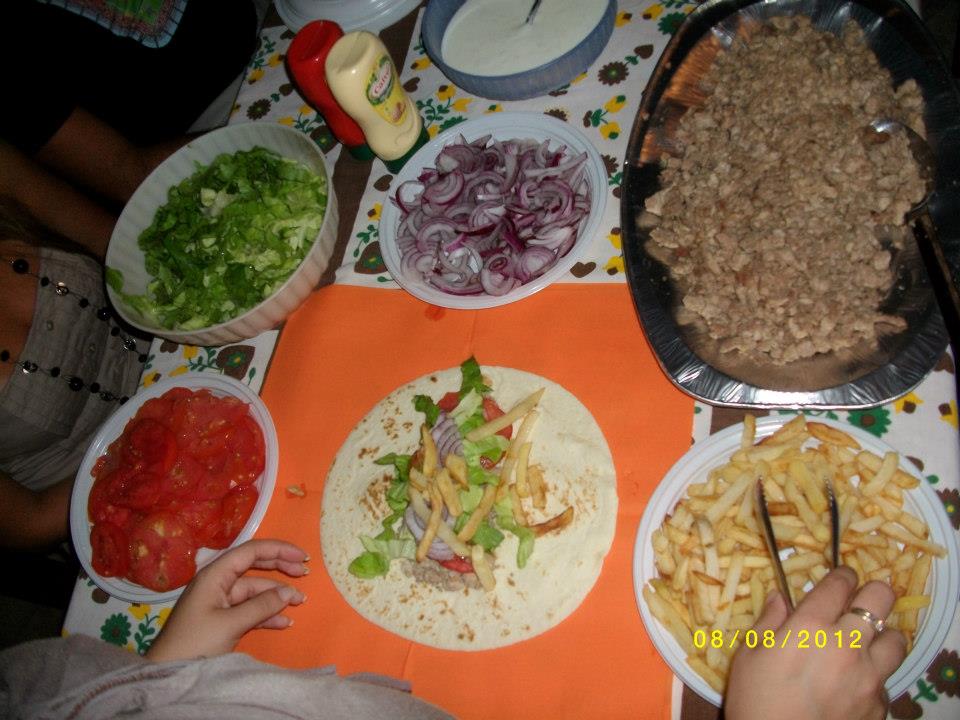 Scaldare la piadina e farcirla con la carne, la salsa e gli ortaggi.