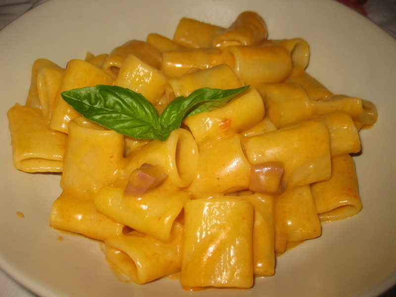 Fare rosolare la pancetta nel burro. Unirvi la passata di pomodoro. Appena sarà cotta aggiungervi la scamorza tagliata a cubetti e girare. Chiudere il fuoco e aggiungere la panna.