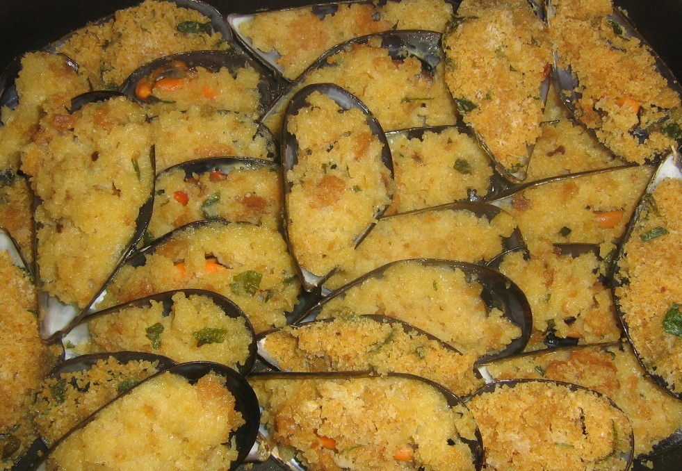 In una ciotola ponete la mollica di pane triturata, il parmigiano grattugiato, gli spicchi d'aglio tritati, i due cucchiai di prezzemolo tritato e l’olio extravergine di oliva. Amalgamate il tutto e riempite il guscio con il mollusco con il composto precedentemente preparato. Mettete quindi le cozze su una teglia coperta da carta da forno e irroratele con dell'olio extravergine di oliva. Infornate infine in forno già caldo (200 °C) in modalità grill per circa 10 minuti, fino a quando le cozze si saranno ben gratinate. Servite le cozze gratinate calde!
