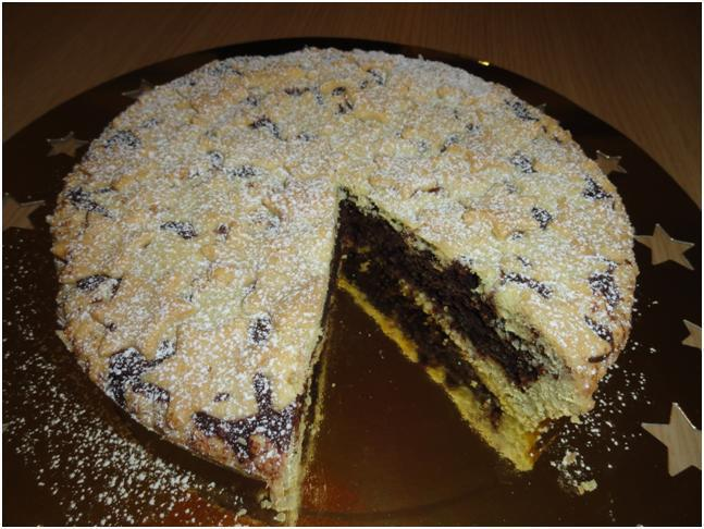 Stendere la frolla in una tortiera, lasciando un bordo di circa 3 cm, versare l'impasto della caprese, con la frolla rimasta ritagliare tante stelline e disporre sulla superficie.