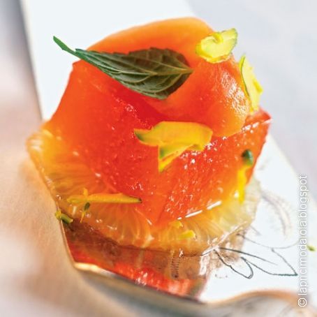 - 400g di succo d’arancia – 200 g di zucchero semolato – 20 g di colla di pesce – chiodo di garofano – 2 arance rosse biologiche – 2 arance gialle biologiche