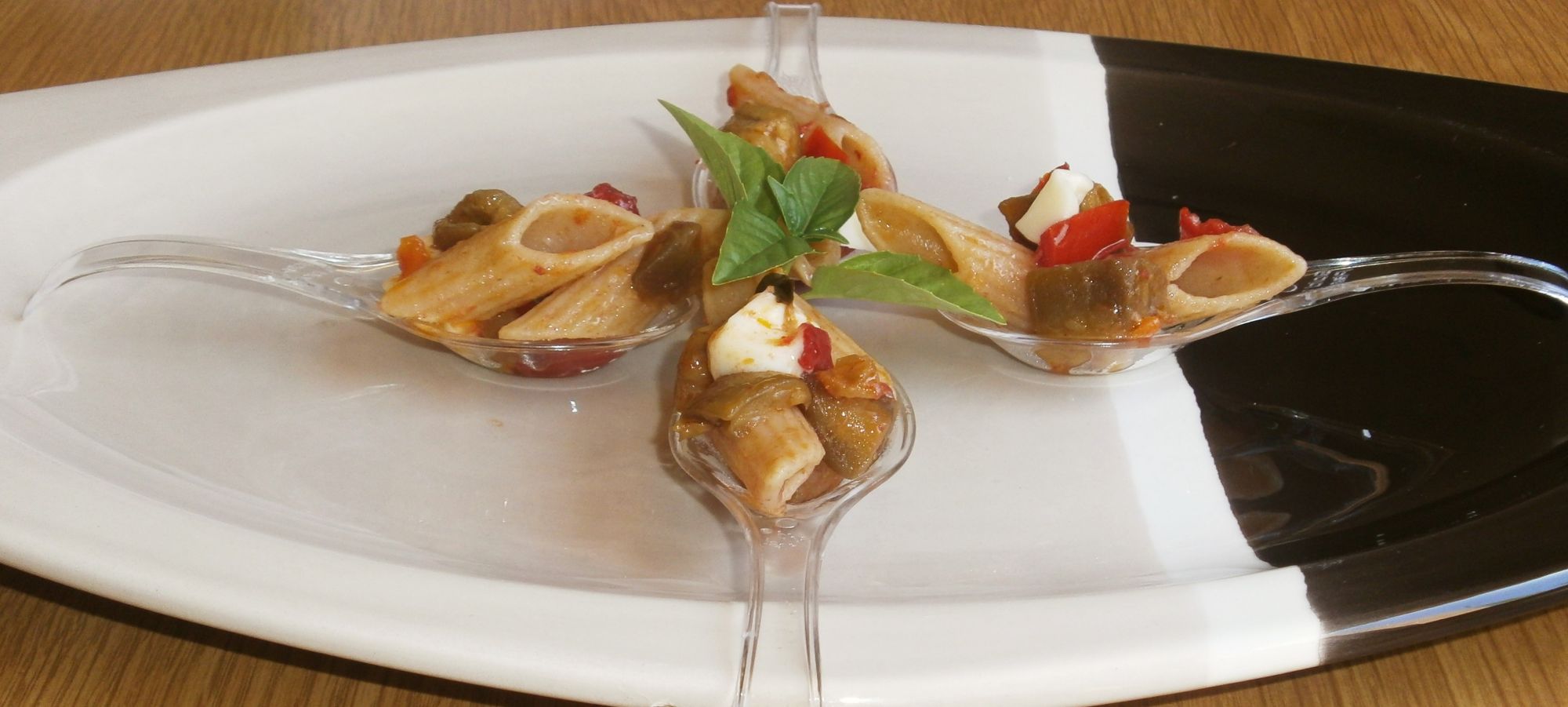- 320 grammi di penne rigate integrali: 1 melanzana;3 pomodori;1 mozzarella tagliata a cubetti;olio d'oliva quanto basta;basilico;1 spicchio d’aglio;sale;30g di parmigiano grattugiato