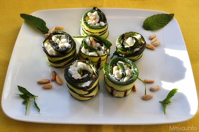 Procedete in questo modo per tutte le fette di zucchine,poi disponetele in piedi uno a fianco dell’altro e servite