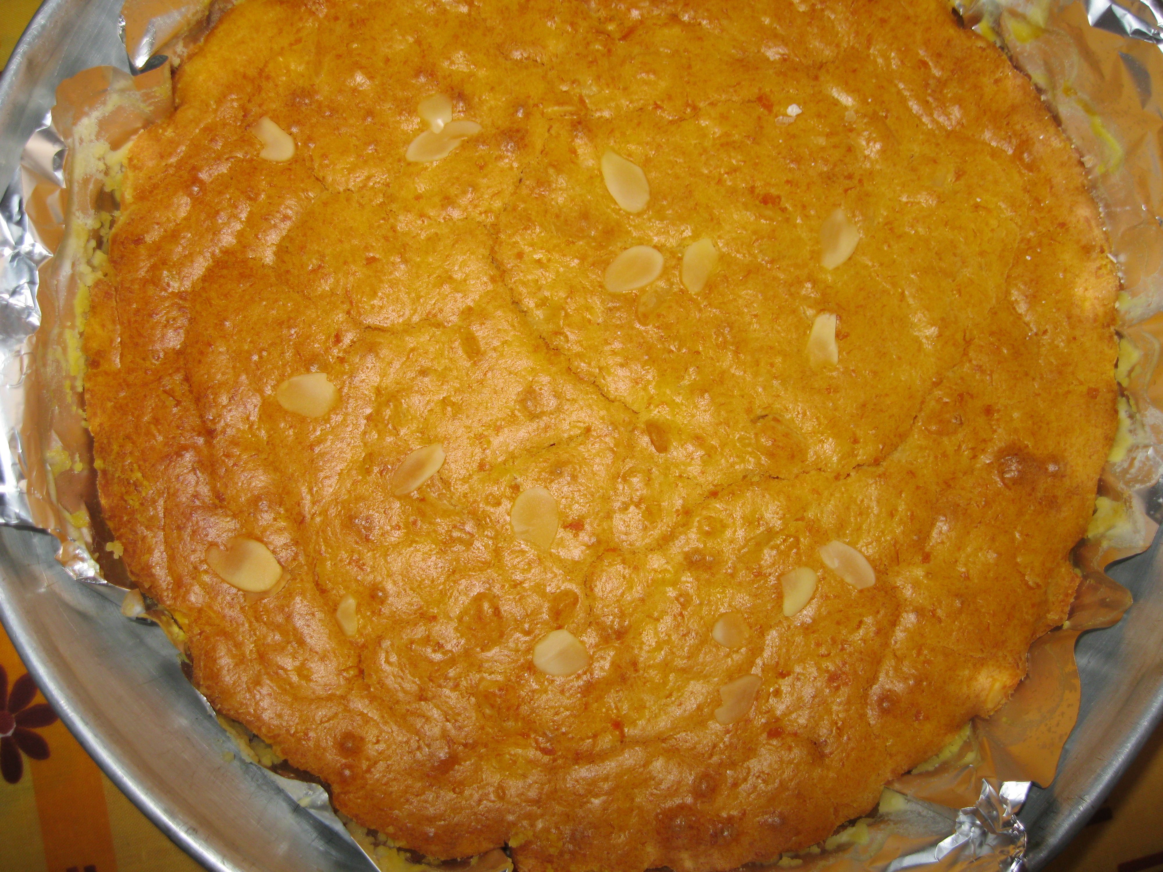 Unite lo zucchero, (aroma) e sale. Impastate a cucchiaiate la farina , (frumina) ed infine il lievito per dolci. Versate l'impasto in una tortiera precedentemente infarinata ed imburrata . Distribuite le rimanenti mandorle sulla superfie del composto.
