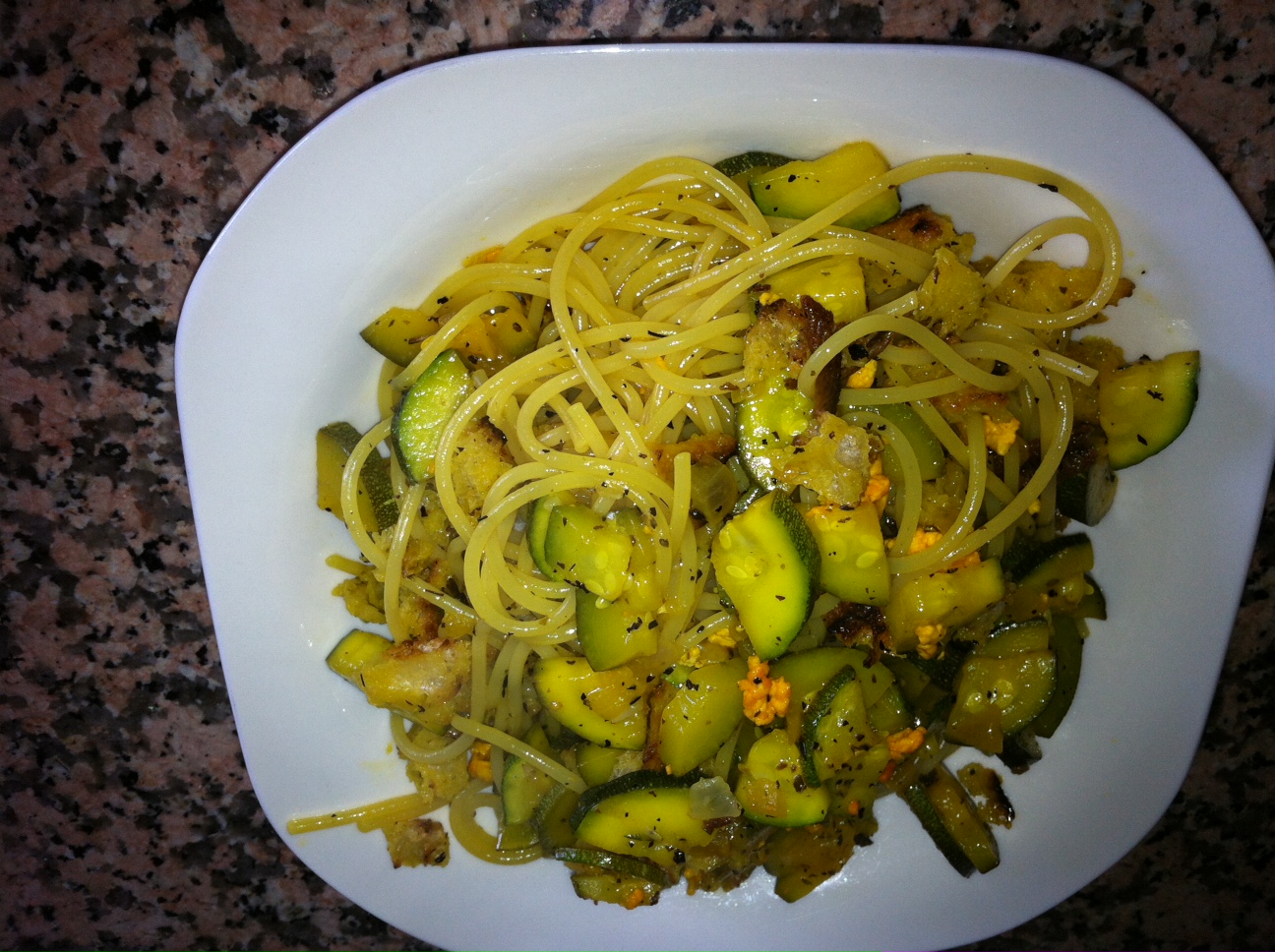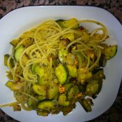 A cottura degli spaghetti, scolarli e condire prima con la verdura e poi con la salsa.