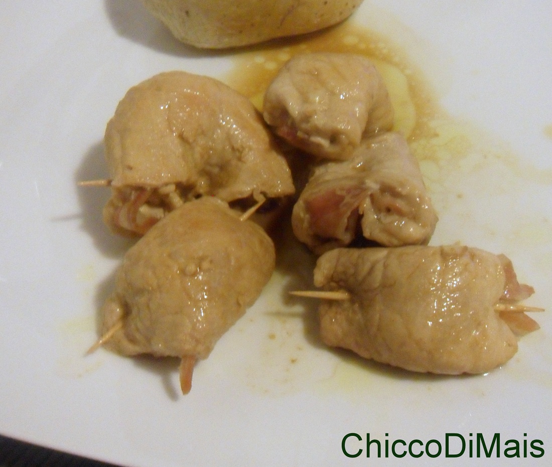 Infarinare gli involtini ottenuti e farli rosolare in una padella con un pochino di olio e salvia. Sfumare con dell'aceto balsamico e aggiungere del brodo sino a cottura ultimata.
