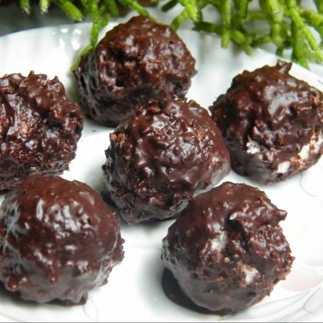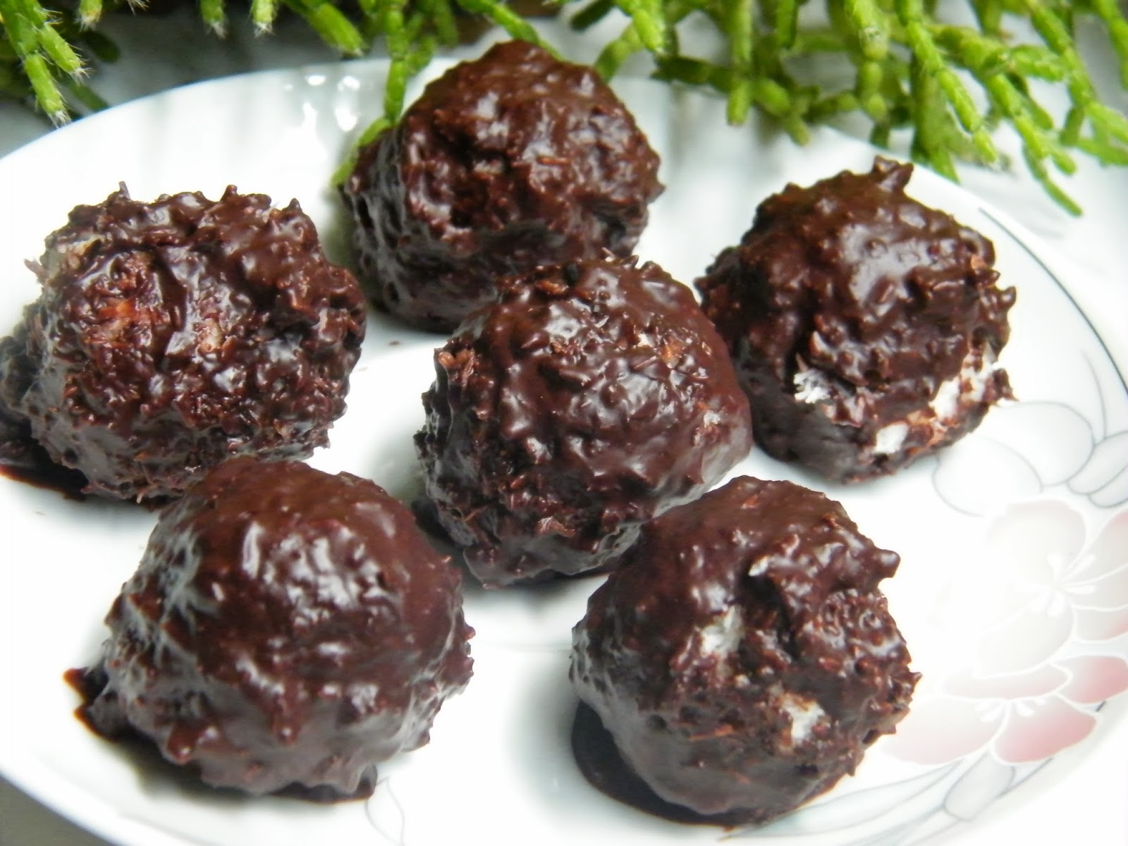 Impastare tutti gli ingredienti (tranne il cioccolato fondente) e creare delle palline. Bagnare il cioccolato a bagnomaria e ricoprire le palline di cocco.