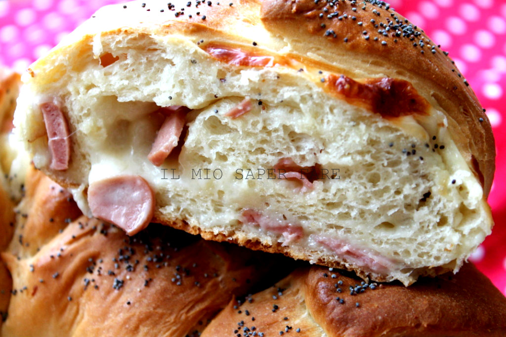 Trasferire il composto in una teglia per ciambella, farcire con prosciutto e formaggio e cuocere.