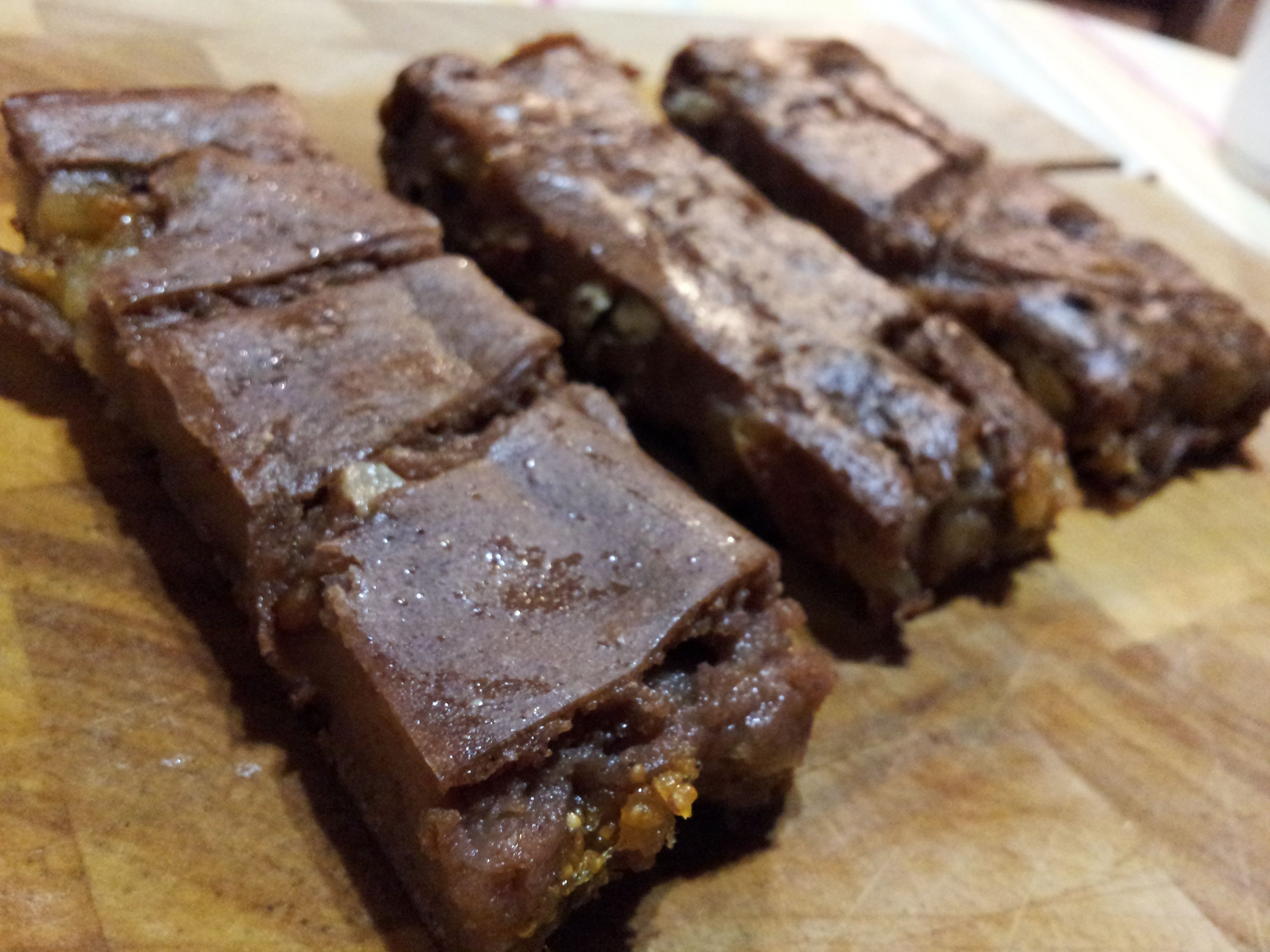 Tagliate i fichi secchi a pezzettini.Setacciate la farina, aggiungete lo zucchero e il sale e mescolate. Aggiungete l acqua piano piano mescolando continuamente con una frusta in modo da non far formare grumi. Una volta messa tutta l acqua aggiungete i fichi secchi tagliati e le noci sgusciate e fatte a pezzetti. Lasciate riposare ancheuna mezzora. Riscaldate il forno a 200 gradi. Oliate bene una teglia piuttosto grande (io ho usato una lasagnera antiaderente), versate il composto in modo da distribuire in modo omogeneo la frutta secca che contiene , passate sopra un filo di olio evo e infornate a 200 gradi per i primi 15 20 minuti poi abbassate a 180 fino per altri 25 30 minuti.