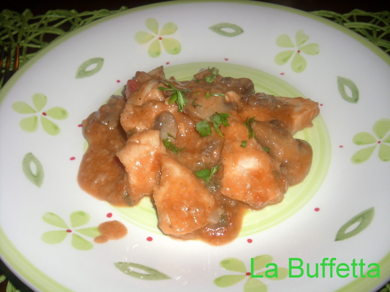 Tagliate il petto di pollo in piccoli pezzi Fate rosolare lo spicchio d'aglio in un cucchiaio di olio togliete l'aglio e aggiungete il pollo precedentemente infarinato e lasciate dorare