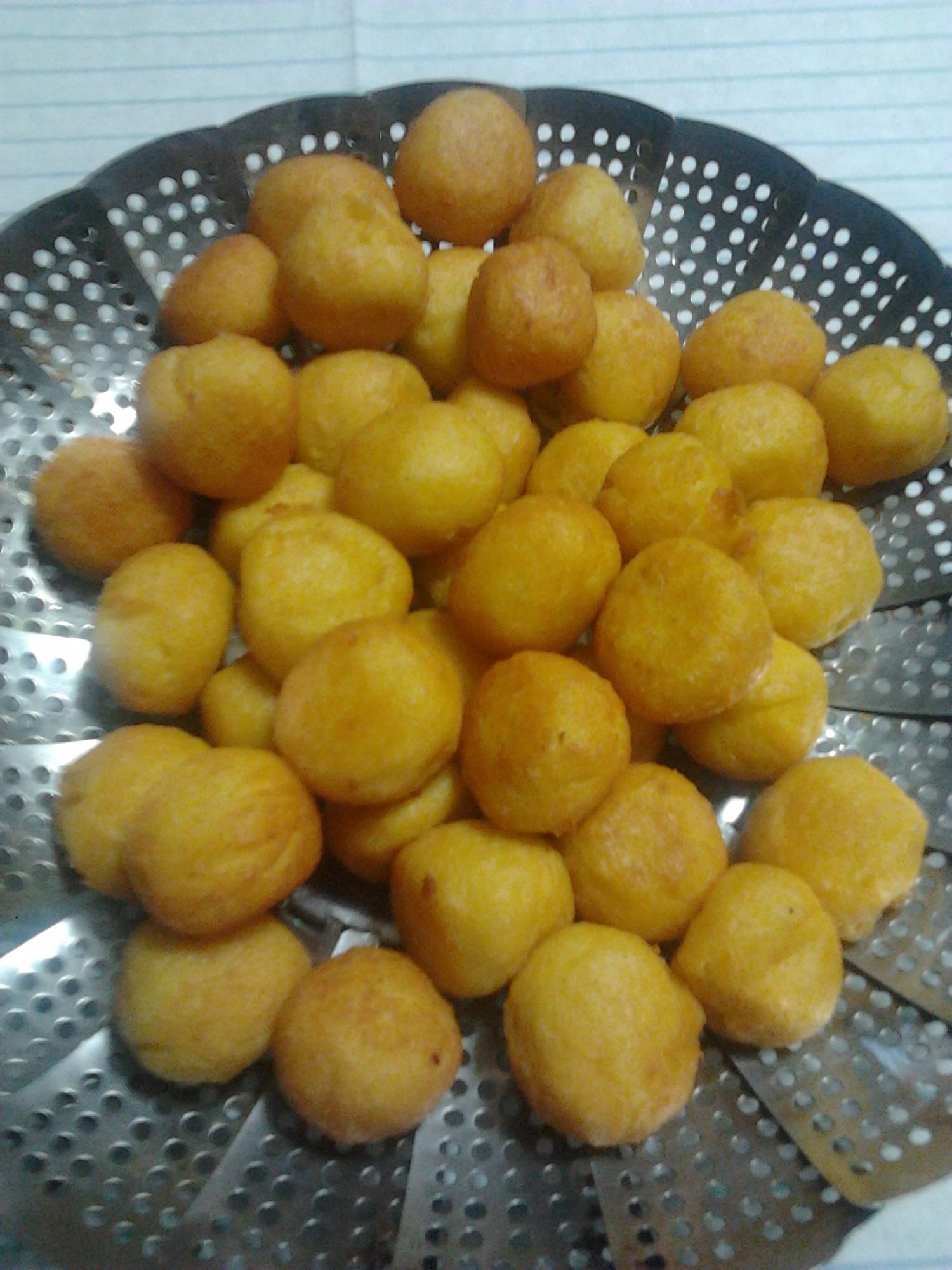 Bollire l' acqua ed il burro. Quando si raggiunge l' ebollizione aggiungere la farina e fare cuocere mescolando. Quando il composto si stacca dalle pareti della pentola, aggiungere le uova una alla volta. Aggiungere le patate e mescolare tutto insieme. Fare delle palline e friggere in abbondante olio caldo.