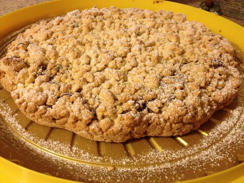 Sciogliere il burro a bagnomaria. Lavorare insieme farina, uova, zucchero, burro fuso e lievito e lavorare il composto con i polpastrelli senza amalgamarlo ma sbriciolandolo in maniera non omogenea.