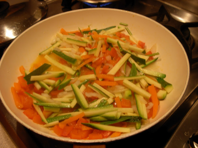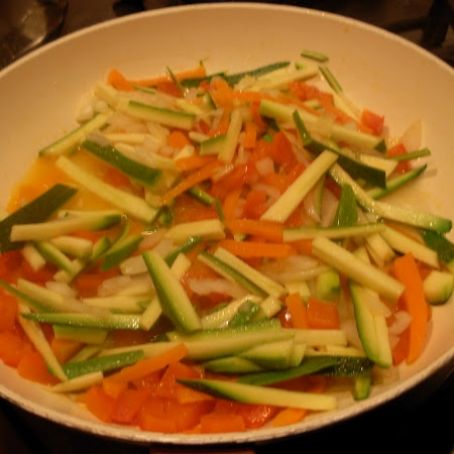 Tagliare le carote e le zucchine a julienne, farle saltare in una padella con un goccio d'olio per qualche minuto.