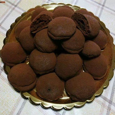 4. Cuocere a 180° per 10 minuti, sfornare e rotolare velocemente ogni biscotto in un pochino di cacao amaro in polvere. Lasciar raffreddare, eventualmente rotolare ancora in poco cacao amaro e mangiare.