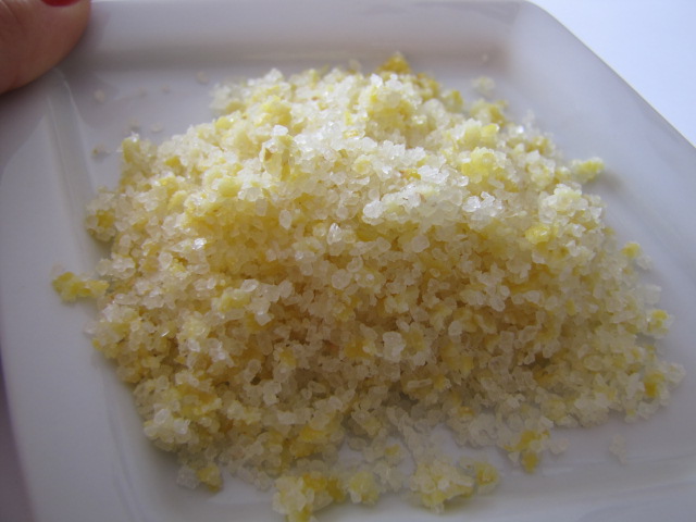 Mettere in un mixer il sale e la scorza degli agrumi e tritare per qualche minuto. Stendere il sale aromatizzato agli agrumi in una teglia da forno foderata con carta e far asciugare in forno a 50° C per 10 minuti. Versare il sale in un vasetto di vetro a chiusura ermetica.