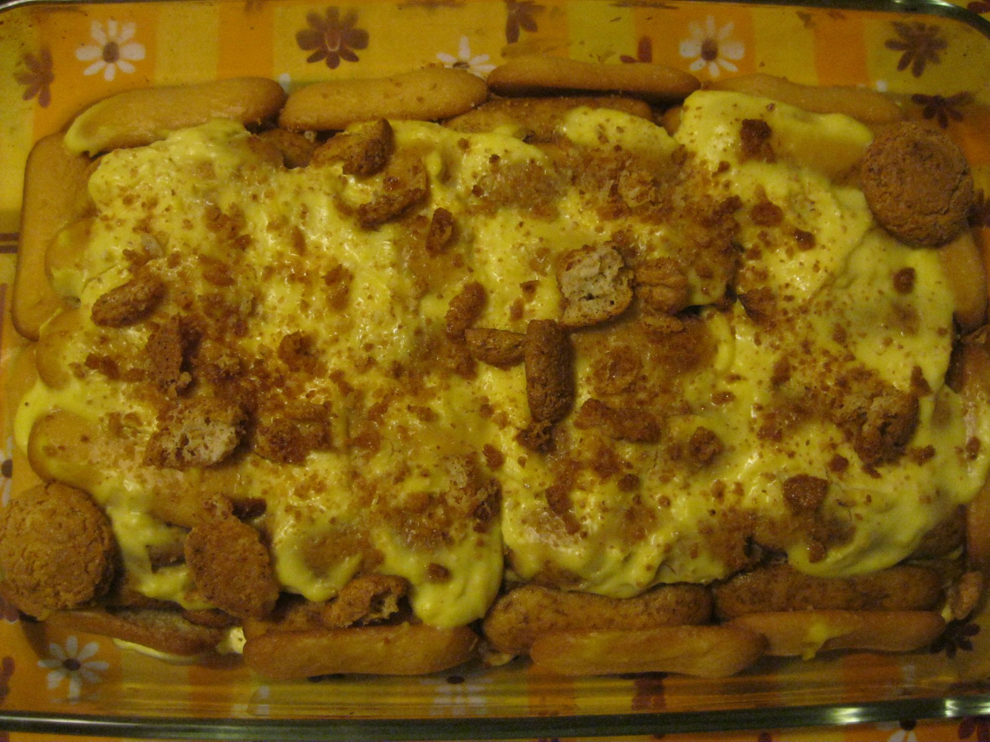 Golosa variante del classico tiramisù preparto con biscotti all'uovo e con gli amaretti sbriciolati .