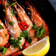 Lavare i gamberi. Tritare il prezzemolo e l'aglio grossolanamente. Mettere il tutto in una teglia da forno e infornare a 180° per 15 minuti