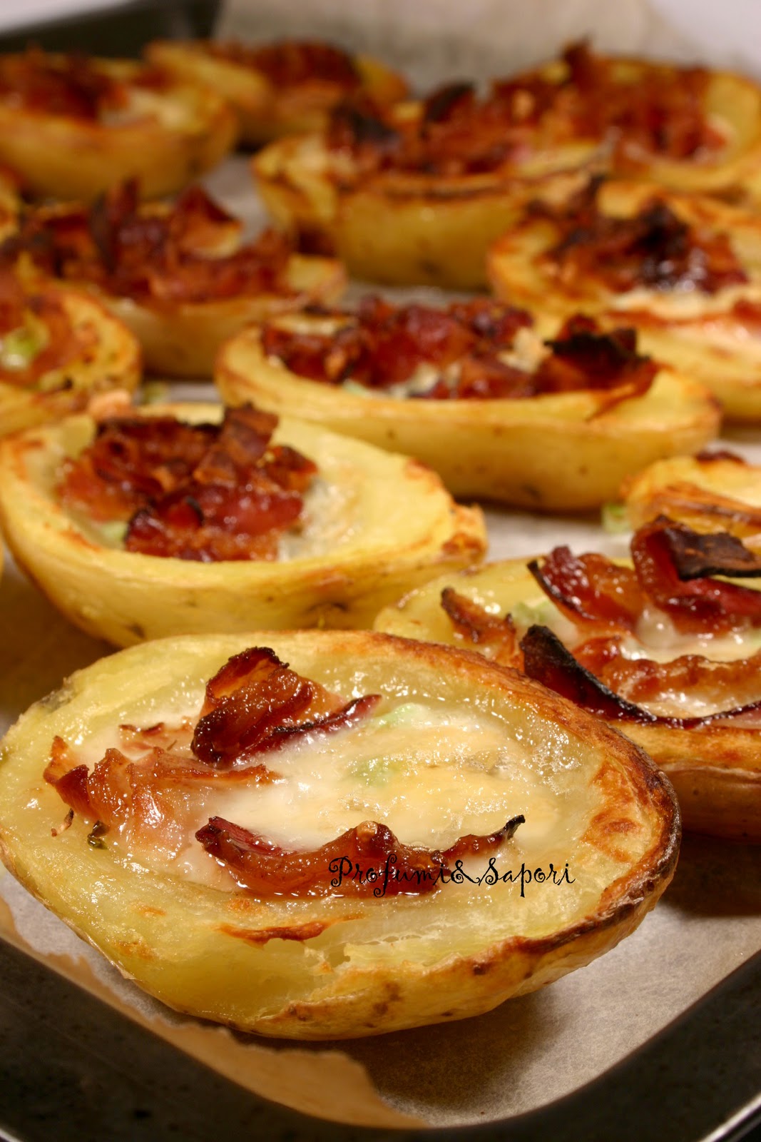 Pelate le patate, lavatele e sbollentatele intere per circa 20 minuti in acqua salata in ebollizione, poi scolatele e tagliatele a metà. Svuotatele deponendo la polpa in una terrina. Amalgamare alla polpa gli altri ingredienti e poi farcire le patate. Collocate le barchette di patate così preparate sopra una teglia di burro e ponetela in forno preriscaldato a 180° per 30 minuti.