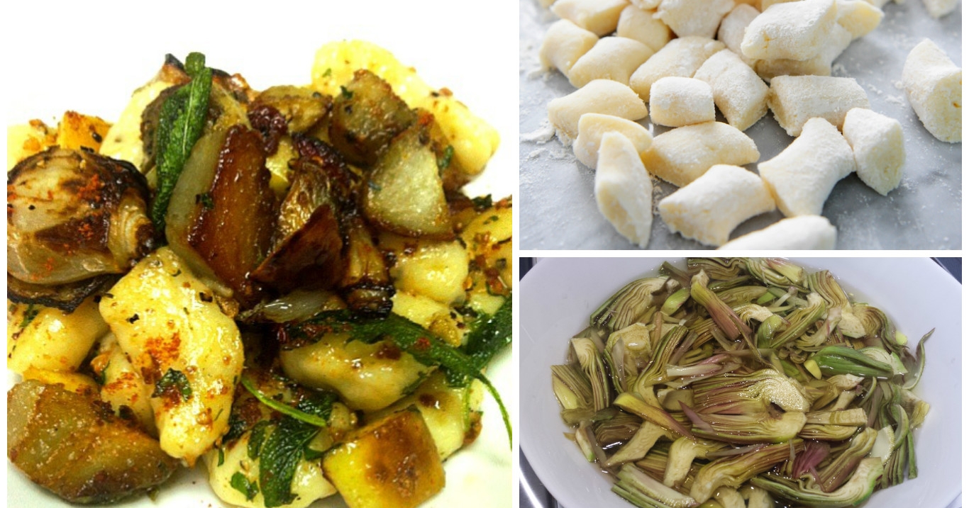 Scolare gli gnocchi quando salgono a galla direttamente nella padella con i carciofi, unire due cucchiai di acqua di cottura, la pancetta e mantecare con attenzione su fuoco vivace, mescolando il tutto delicatamente.