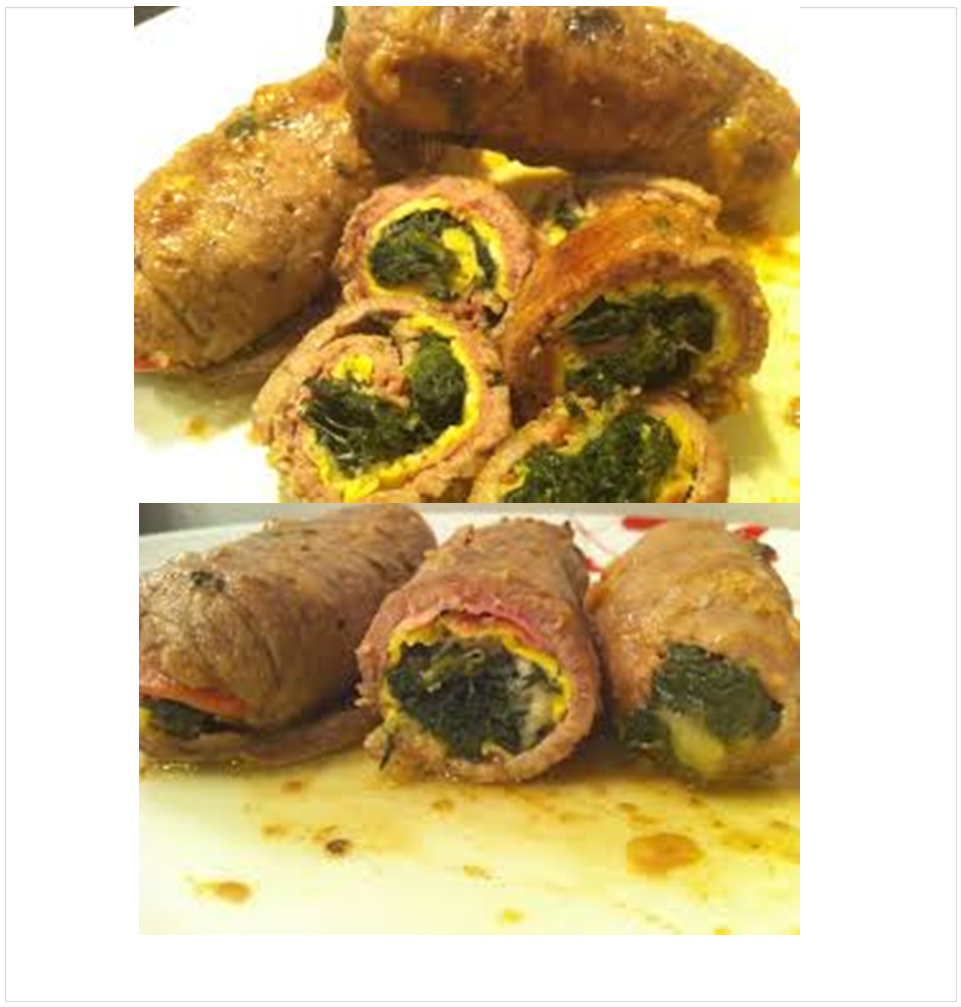 Fate lessare gli spinaci e tagliateli finemente a pezzettini. Nel frattempo preparate una frittata di sole uova molto sottile (tipo crepes) e mettete in ciascuna fetta di carne un pò di mortadella, una fetta di fontina, un pezzo di frittata e un pò di spinaci. Condite con sale e salvia e chiudere con degli stuzzicadenti. Non vi resta che cuocere gli involtini per 5 minuti facendo venire una bella crosticina ed il gioco e fatto!!