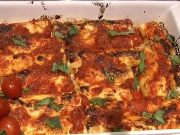 Mettere su un fondo di una pirofila rettangolare un mestolo di sugo, sistemare i cannelloni e coprire col sugo rimasto.