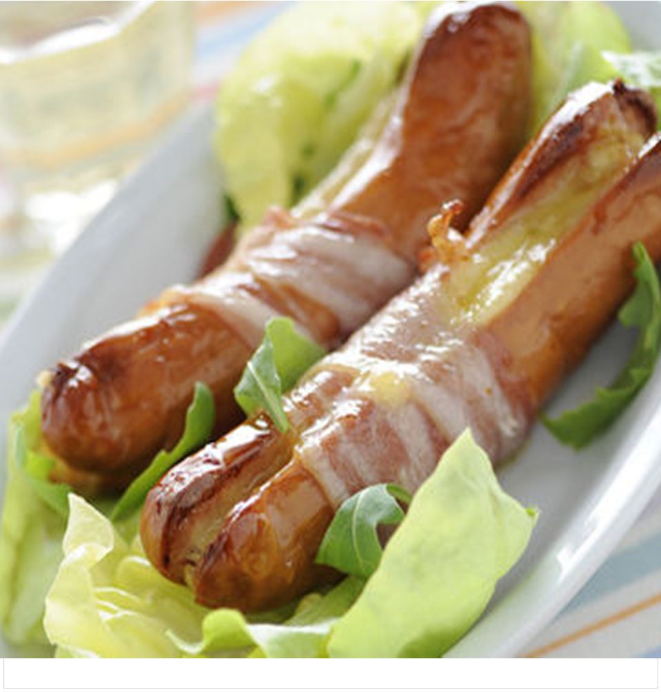 3) Avvolgete al centro di ciascun wYrstel farcito 1 fetta di pancetta affumicata o di bacon. Stringete delicatamente le