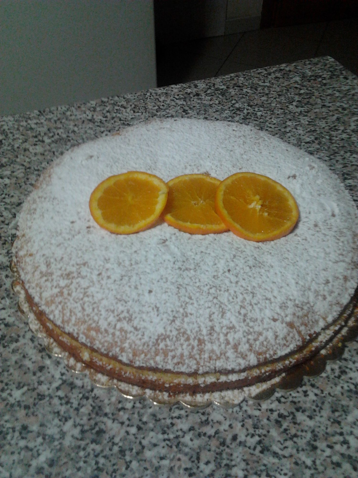 Per la crema: mescolare zucchero e farina, aggiungere il succo e mescolare bene. Portare ad ebollizione fino a quando diventa lisci e densa. Versare sulla torta e richiudere i dischi. Infine cospargere con zucchero a velo e decorare con fette di arancia