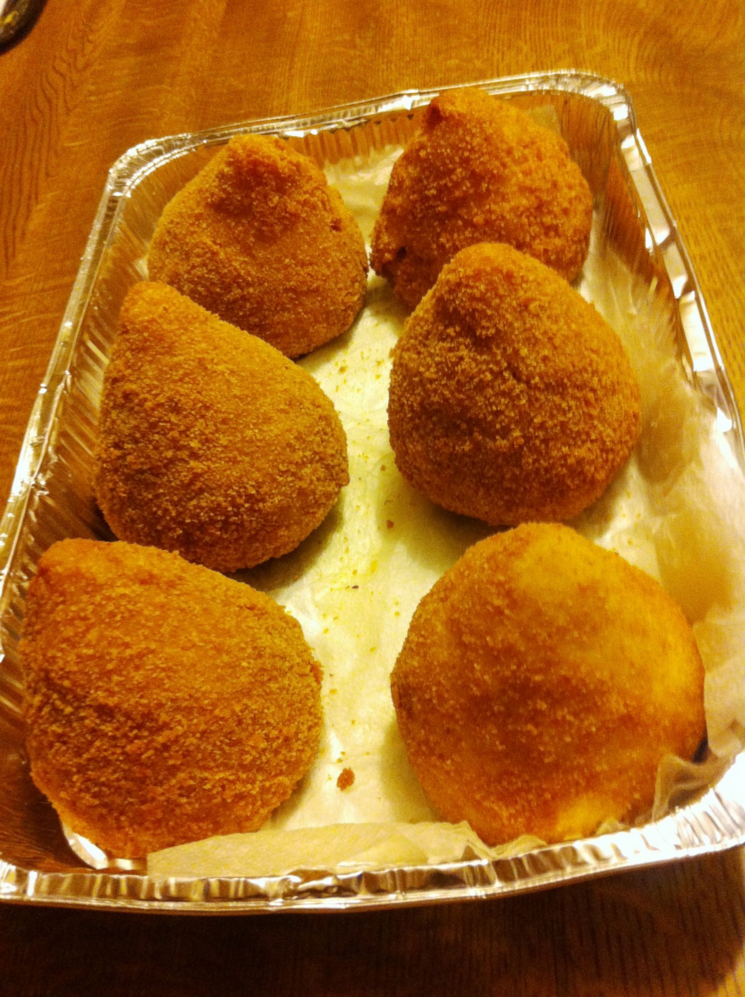 Passate gli arancini nella farina, poi nelle uova sbattute.