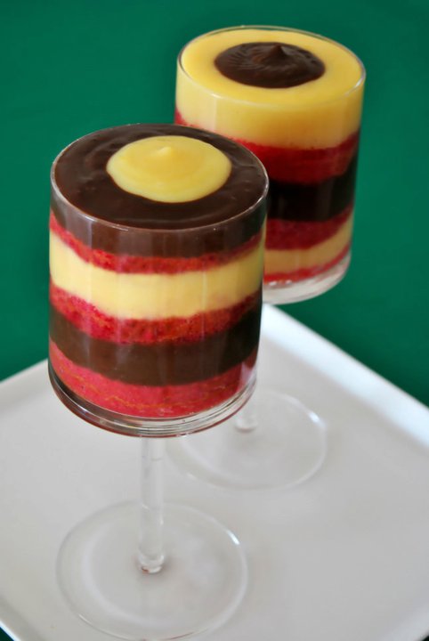 In coppe o bicchieri individuali, alternare strati di biscotti inzuppati con strati due budini.