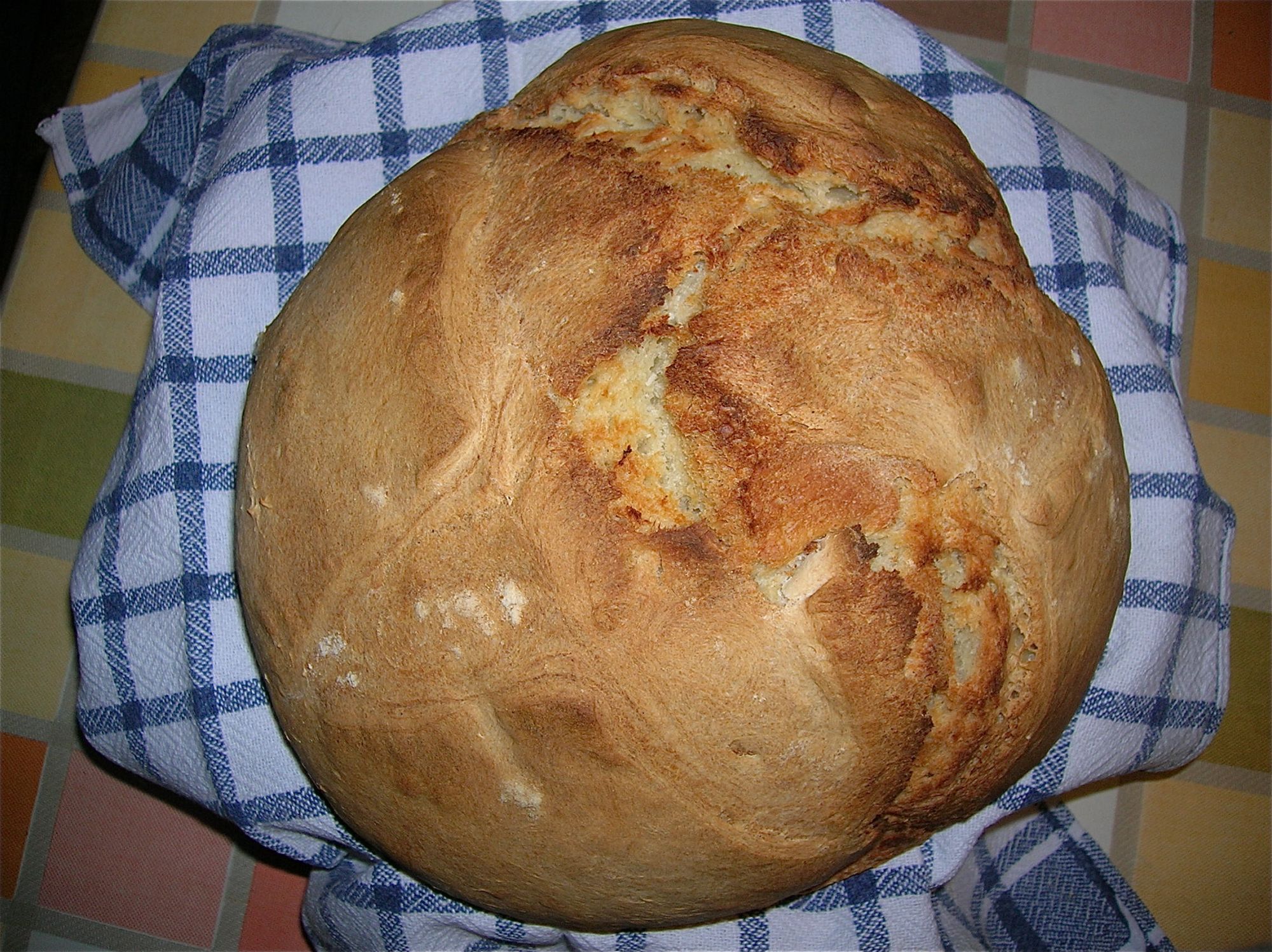 Passate un paio d'ore, accendere il forno al massimo e una volta caldo infornare il pane per 10 minuti, poi togliere dalla teglia, appoggiare sulla griglia e abbassare la temperatura a 180°.