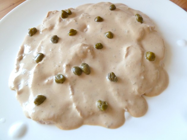 In una ciotola mettere i tuorli, l’aceto, un pizzico di sale e mescolare il tutto con una frusta a mano. Aggiungere l’olio d’oliva e continuare a mescolare. Nel mixer frullare il tonno sgocciolato, i capperi dissalati e le acciughe dissalate e private della lisca centrale. Unire il composto ottenuto alla maionese e mescolare fino ad ottenere un composto omogeneo e denso. A piacere aggiungere un po’ di aceto di vino o del succo di limone.
