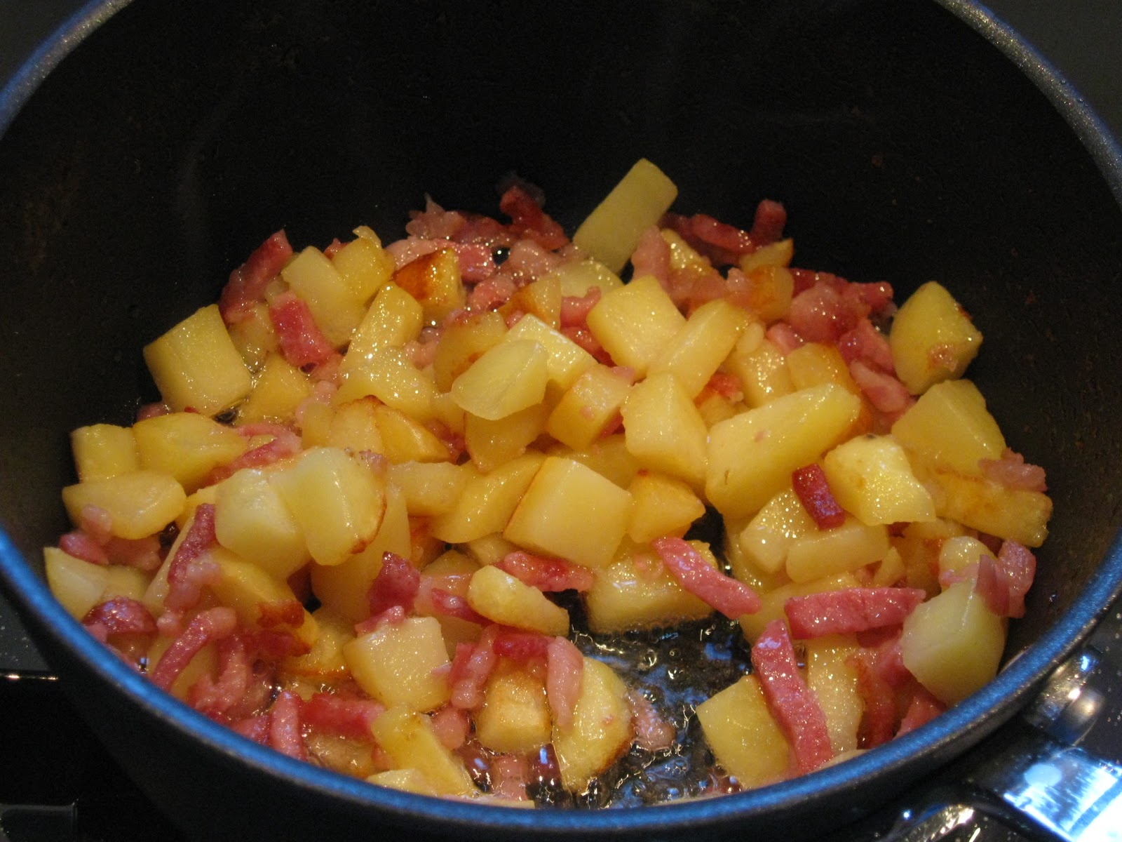 Lavare, pelare e tagliare le patate a rondelle. Sbucciare e affettare in modo un po’ grossolano le cipolle. In una padella con olio caldo rosolare le patate girandole in continuazione. Aggiungere le cipolle e la pancetta (o bacon), coprire con un coperchio e cuocere a fiamma bassa per 8 minuti. Aggiungere un bicchiere d’acqua calda con lo zafferano sciolto in essa, scoperchiare e cuocere fino a quando le patate non saranno pronte. Unire le uova sbattute e mescolare bene. Aggiungere sale, pepe e il prezzemolo spezzettato grossolanamente. Servire ben caldo.