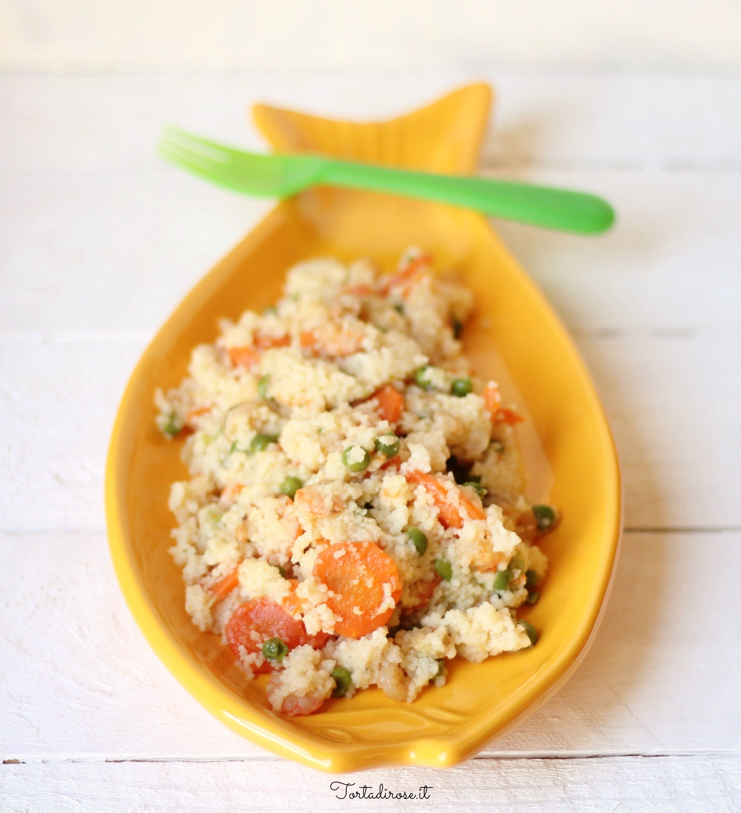 Mettere il couscous in una ciotola e coprire con acqua bollente (lasciare che raddoppi il suo volume), far riposare per 5 minuti (o comunque seguire il procedimento consigliato dal produttore). Separare i granuli con una forchetta, unire i piselli e le carote, infine i gamberetti, aggiustare di sale e pepe macinato. Mescolare delicatamente e servire.